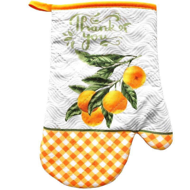 Dekorem pomerančů jednostranně potištěná 100% bavlněná kuchyňská chňapka.