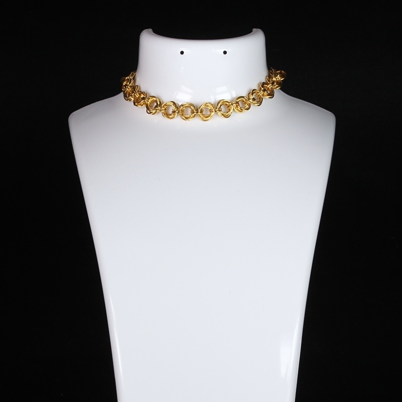 O něco masivnější náramek vytvořený z kovových kroužků zlaté barvy.