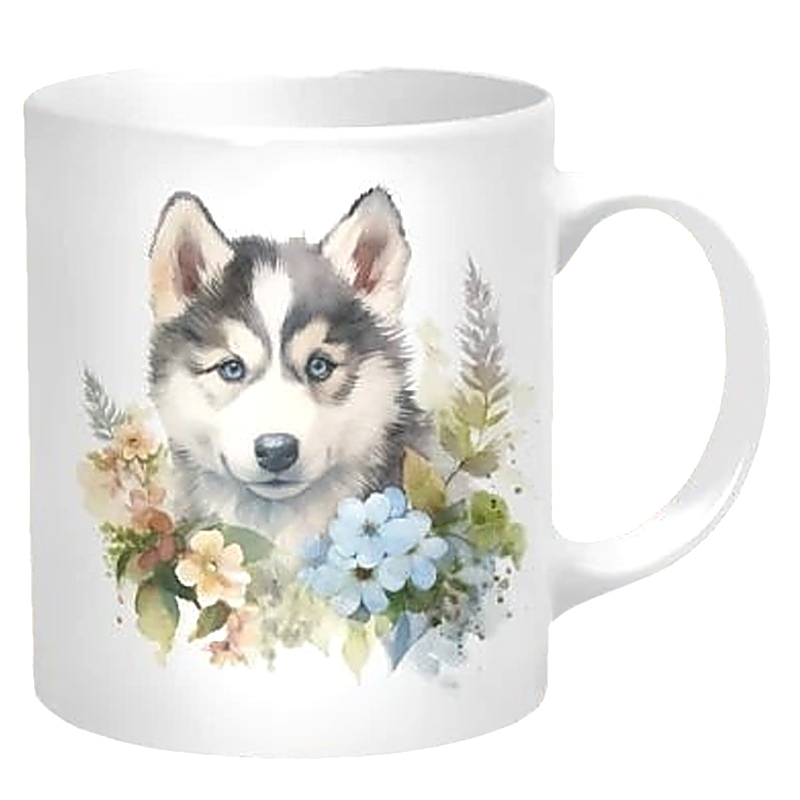 Krásný dětský hrnek ozdobený malým roztomilým rošťákem husky.