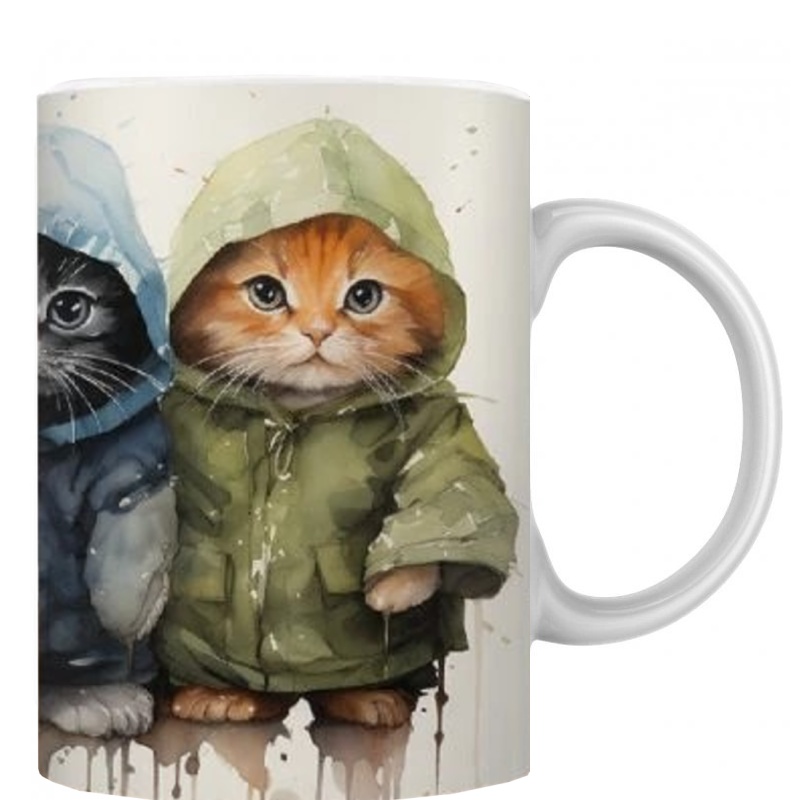 Hravý hrnek s obrázkem koťátek v pláštěnce.
