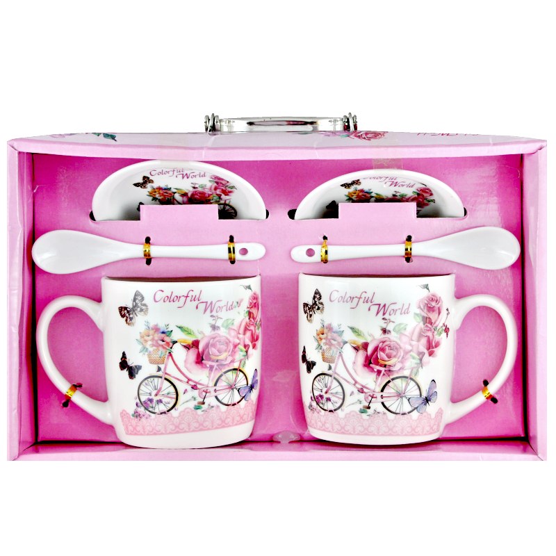 Hrnek 2x 300ml, podšálek, Bicykl s růží, kufřík