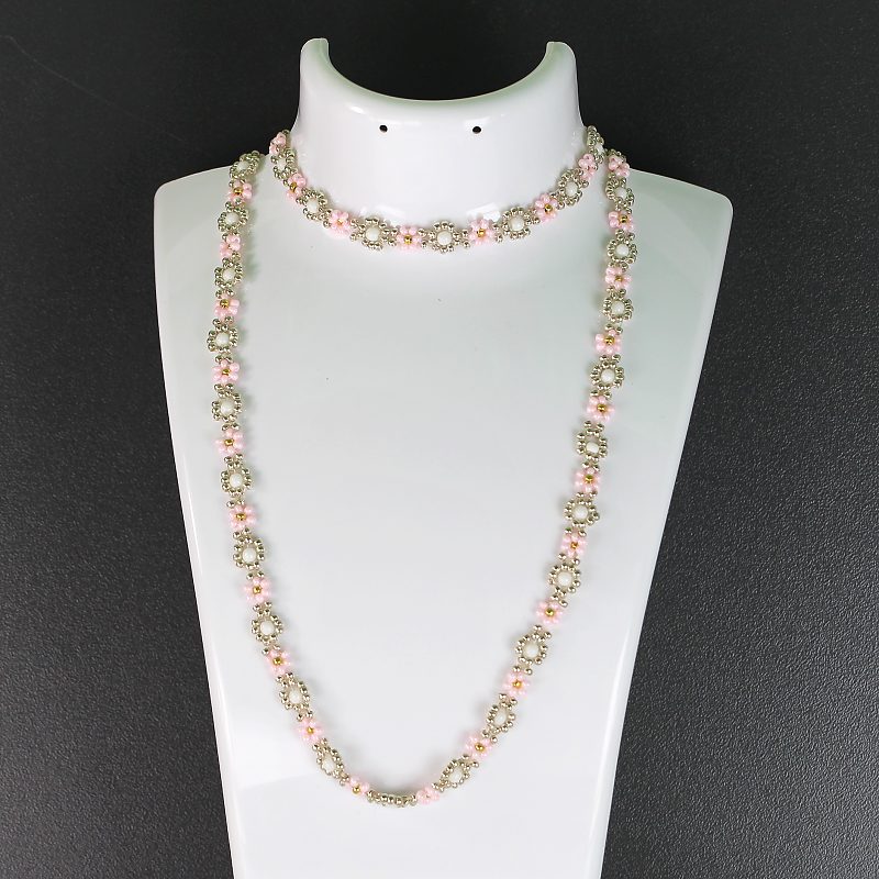 Třpytivě lesklé stříbrné skleněné perličky v kombinaci s drobounkými kvítky matných růžových korálků vytváří působivý a vizuálně velice jemný celek, který okamžitě upoutá pozornost.