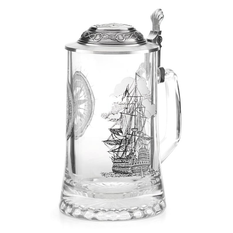 Exkluzivní stylový skleněný půllitr s cínovým víčkem a leptaným dekorem pro každého kormidelníka a mořeplavce.