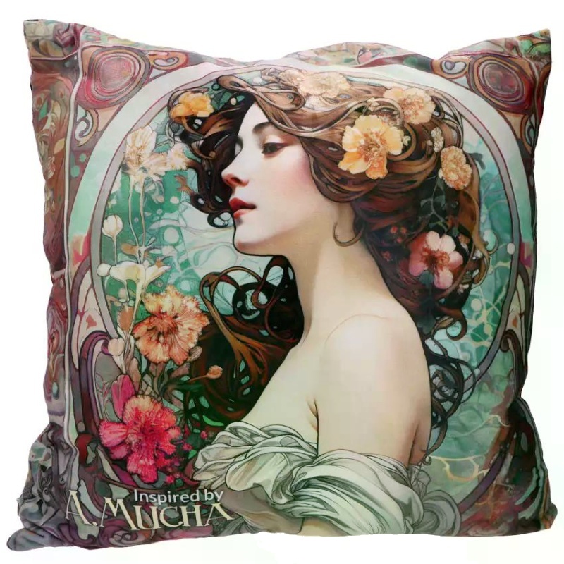 Polštářek s kouzelným dekorem inspirovaným dílem slavného českého malíře a grafika Alfonse Muchy.