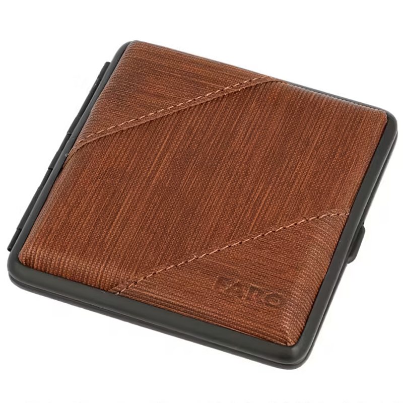 Kovová, vkusně zdobená koženkou, uchycení cigaret pomocí gumiček.