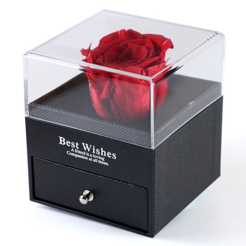 Růžový květ jako živý je uložen ve vkusném soklíku, v jehož spodní části je uložena malá zásuvka s překvapením v podobě drobného šperku.
